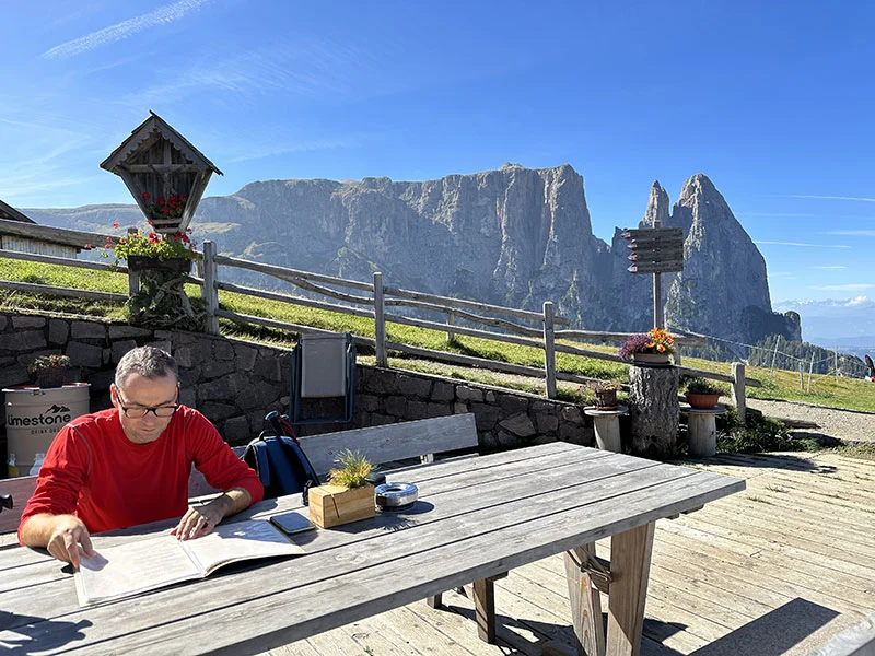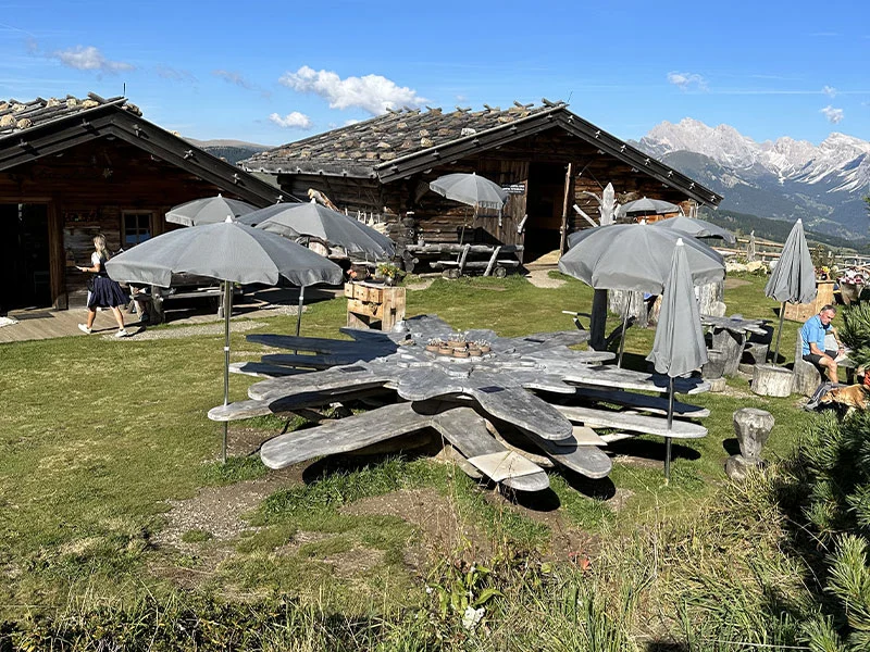 La Edelweiss Hütte è la più bella di tutta l’Alpe! Tutta il legno, con il tavolone principale fatto a stella alpina (edelweiss appunto), ha una vista stratosferica sul Sassolungo ed il Sassopiatto. E’ praticamente opposta rispetto al precedente rifugio e consiglio di raggiungerla in tarda mattinata o addirittura nel pomeriggio.