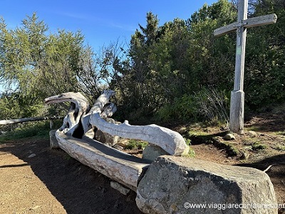 Una bellissima e simpaticissima scultura in legno si affaccia su di un panorama strepitoso ed un cielo terso, grazie alle splendide giornate che abbiamo avuto. Nonostante il luogo sia veramente eccezionale, non sarà il punto più bello dell’escursione.
