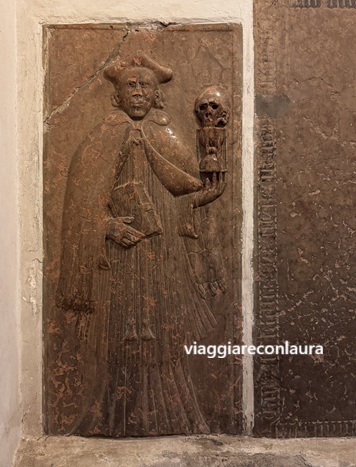Alcune delle lastre tombali, che un tempo erano incastonate nel pavimento, sono ora esposte sulle pareti del corridoio di collegamento. Una delle prime in particolare, è piuttosto macabra (vedi foto allegata).