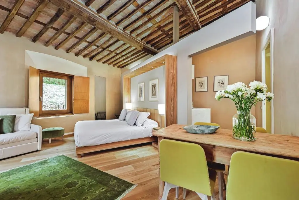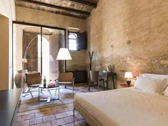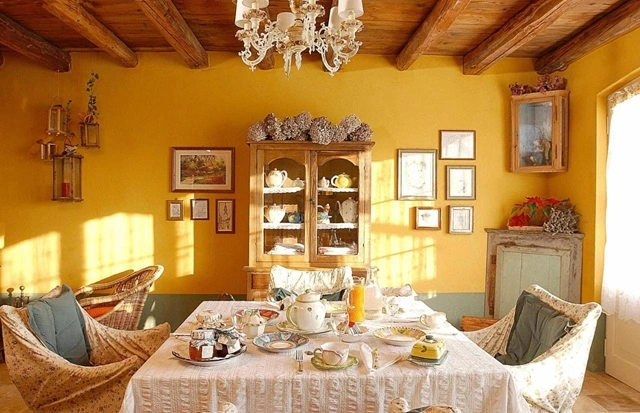 Gli interni sono una delizia, con travi a vista, colonne e muri dai toni caldi. Le camere sono tutte diverse e rispecchiano il buon gusto della proprietaria, che le ha arredate come fossero dei bon-bon.