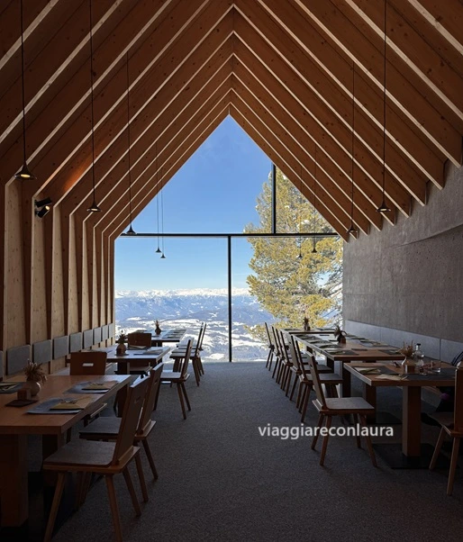 Si può sostare sulla bella terrazza panoramica (senza prenotazione), oppure decidere di godersi gli interni, tutti in legno di larice, e pranzare con vista.
