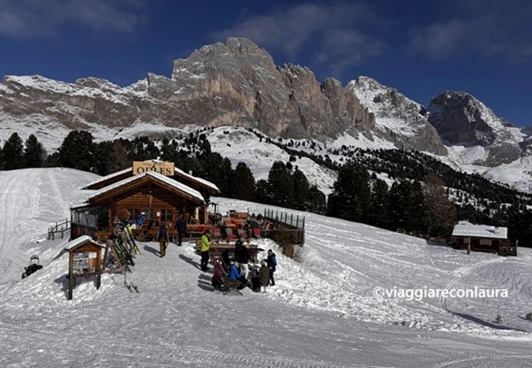 Una volta a monte, troverete subito lo Chalet Resciesa, dove poter pranzare e godersi una vista meravigliosa su Sasso Piatto e Sassolungo.