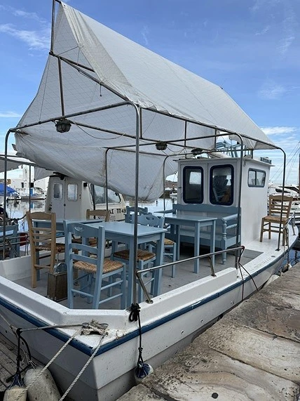 Sempre sulla piazzetta c’è anche un’altra taverna che permette anche di mangiare su una piccola barca attraccata nel porticciolo a fianco. E’ turistico, ma carino. Occhio solo perchè si balla un po’. La taverna si chiama Moschonas.