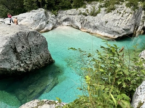 A circa 30 minuti da Tolmino, arriverete nella Valle del fiume Soča, ovvero l’Isonzo in italiano. Per me è un luogo magico, perchè i colori di questo fiume, grazie ad i fondali calcarei, vanno dal verde acqua al turchese.